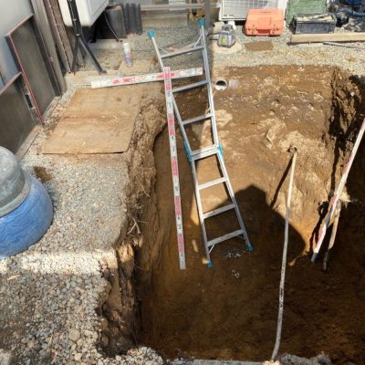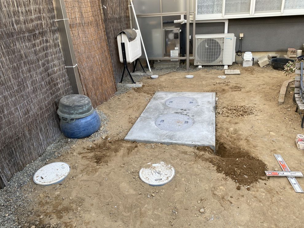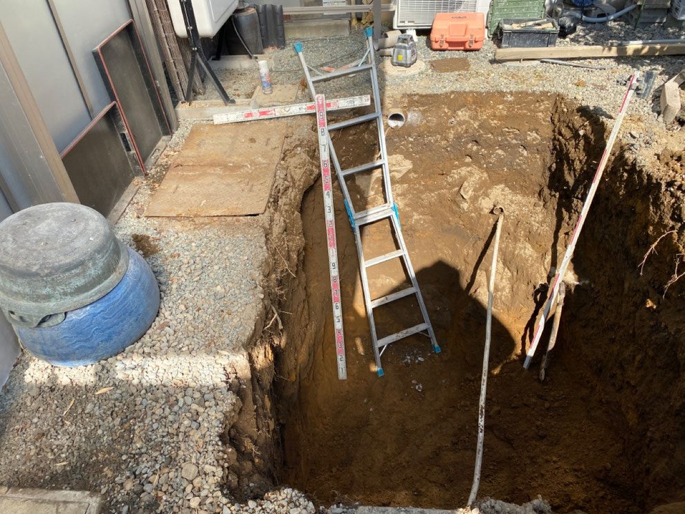 工事ではまず、新しい浄化槽を設置できるように大きな穴を掘削します。浄化槽はサイズが大きく重量もあるため、地盤の安定を確認しながら慎重に掘り進め、設置スペースを確保しました。