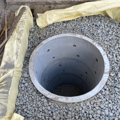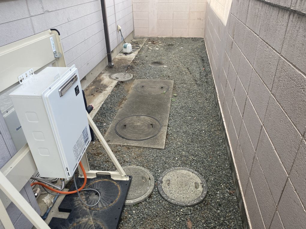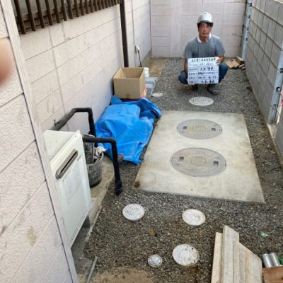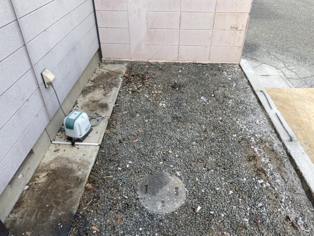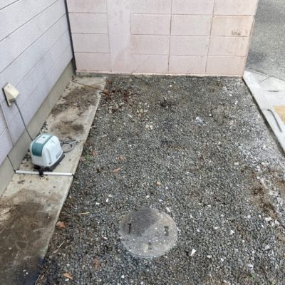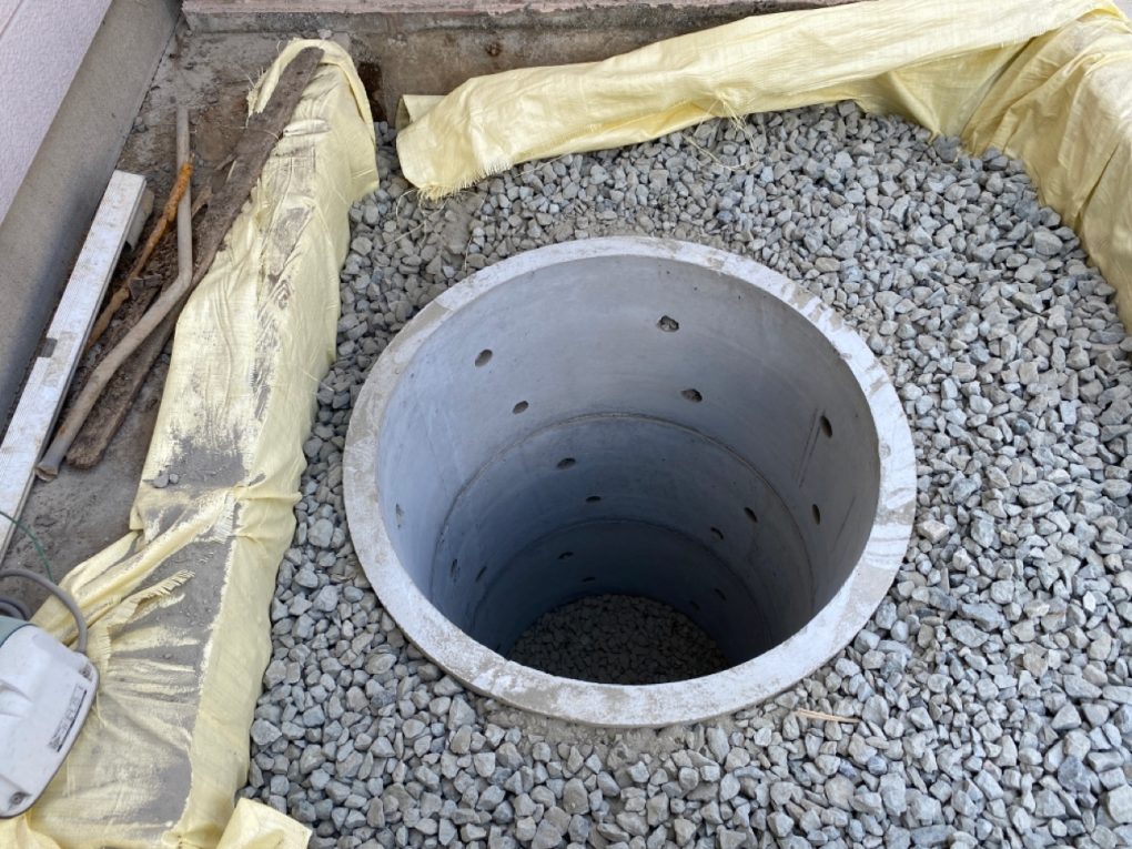 現場は排水を浸透式で処理するエリアでした。しかし、長年使用されている浸透槽が機能しなくなり、水が浸透せずに溜まってしまう状態になっていました。生活に直結する排水トラブルは、早めの解決が求められます。