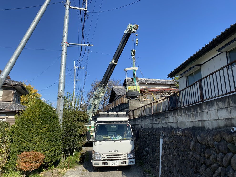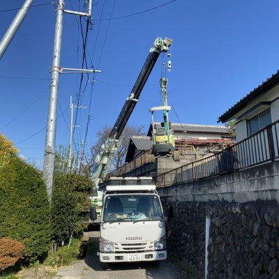 現場は高低差があり、敷地が通常の施工条件とは異なる2m上の位置にありました。そのため、クレーン車を使用し、重機を吊り上げて敷地内に搬入するという特殊な工程が必要でした。高度な技術と安全管理のもと、無事に重機を設置することができました。