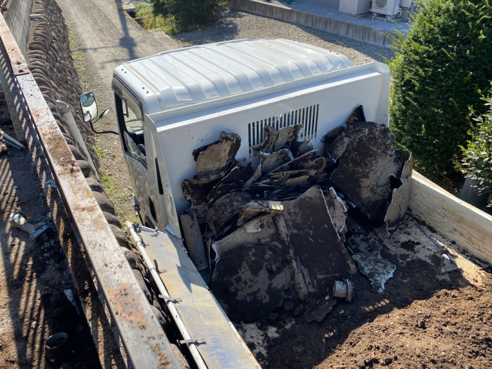 現場には老朽化した浄化槽が残っていましたが、そのままでは搬出できないため、粉々に砕いて撤去しました。狭い場所や特殊な条件下でも、柔軟に対応できるのが私たちの強みです。